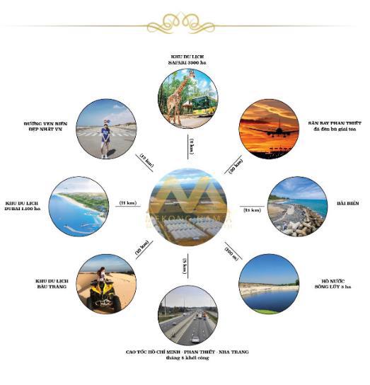 - Cách Quốc Lộ 1A từ 2km, cách KDL sinh thái Safari của Rạng Đông 8km, cách Mũi Né 20km, cách sân bay Phan Thiết 30km, cách TP Phan Thiết 50km.